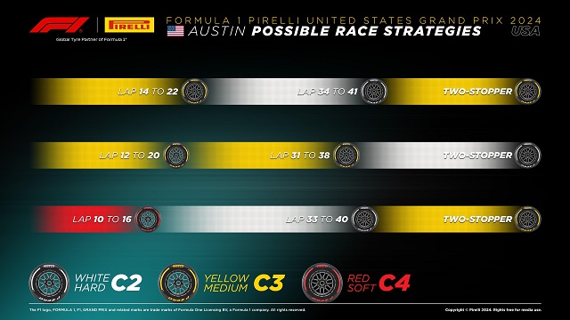 Гран-прі США стане другою гонкою сезону, на яку Піреллі привезла три типи шин: C1 – жорстка, C3 – середня і C4 – м’яка. Востаннє команди отримували таку комбінацію на трасі Спа-Франкоршам у Бельгії.