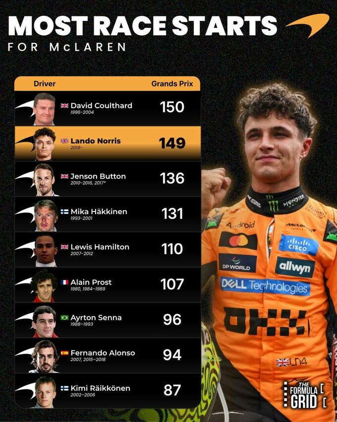 150 стартів. Ландо Норріс повторить рекорд у складі Макларен Британець стане одним із двох найдосвідченіших пілотів за всю історію команди