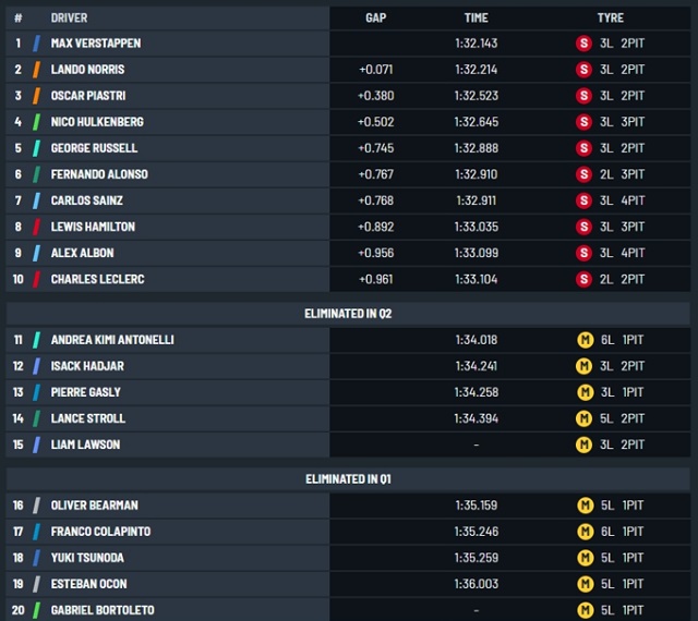 У топ-10 не пробилися Андреа Кімі Антонеллі на Мерседесі та Ісак Аджар на Рейсінг Буллз.