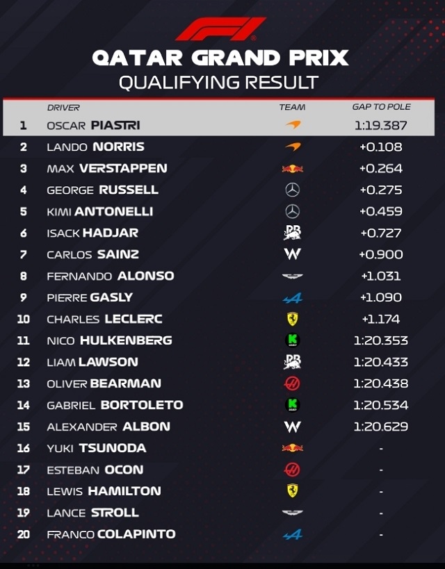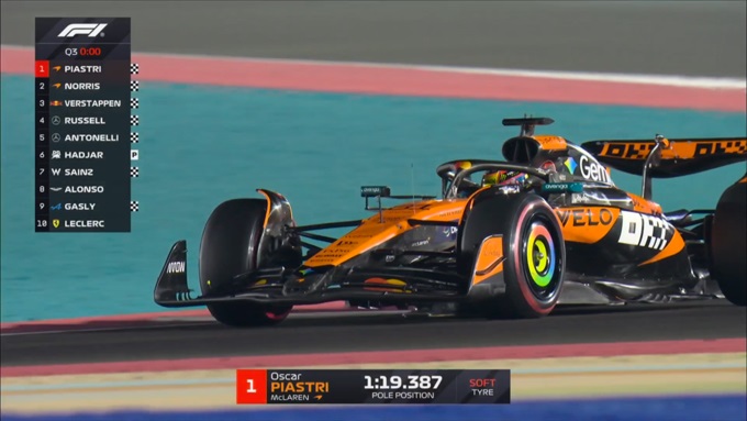 Відбулася кваліфікація Формули-1 у рамках Гран-прі Бахрейну. Поул завоював пілот Макларена Оскар Піастрі, який випередив напарника Ландо Норріса на 0,1 секунди.