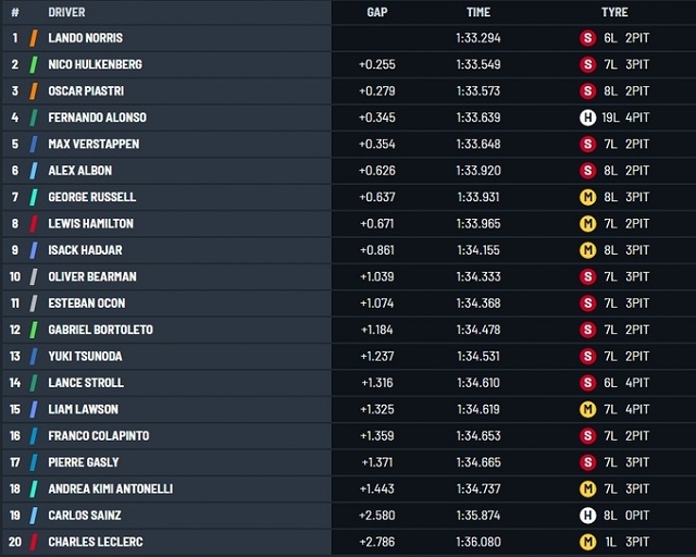 Топ-3 замкнули Ніко Гюлькенберг на Заубері і конкурент Норріса Оскар Піастрі, які відстали на 0,2 секунди.