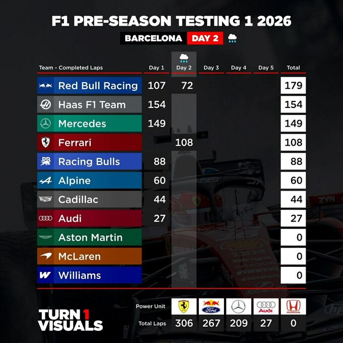 Тести Формули-1. Аварія Ред Булл і успішний дебют Феррарі Який пробіг кіл у кожної команди після другого дня