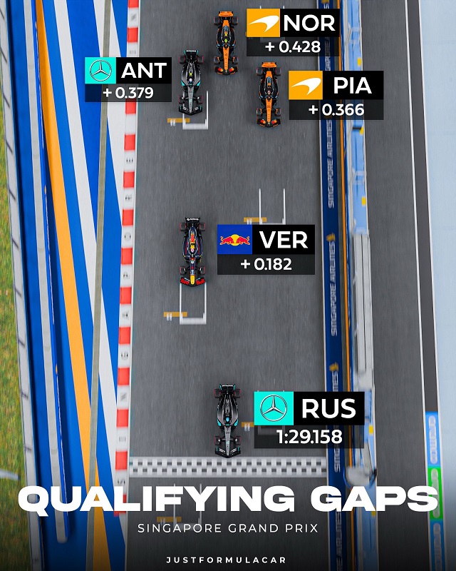 До цієї події JUST FORMULACAR підготували візуалізацію відривів у кваліфікації Гран-прі Сінгапуру, яка показує розриви між пілотами Макларен, Ред Булл та Мерседес.