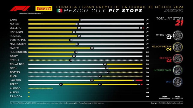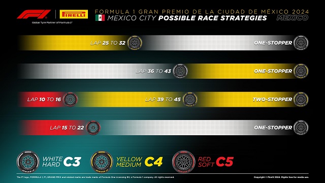 Як і у США, Піреллі підготувала для Гран-прі Мексики нестандартний набір шин. Знову найтвердіший комплект буде на один щабель жорсткішим, ніж зазвичай: C2 – хард, C4 – мідіум, а C5 – софт.
