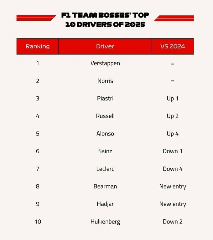 Повна десятка найкращих пілотів за версією керівників команд і порівняння з минулорічним рейтингом наведені на фото нижче.