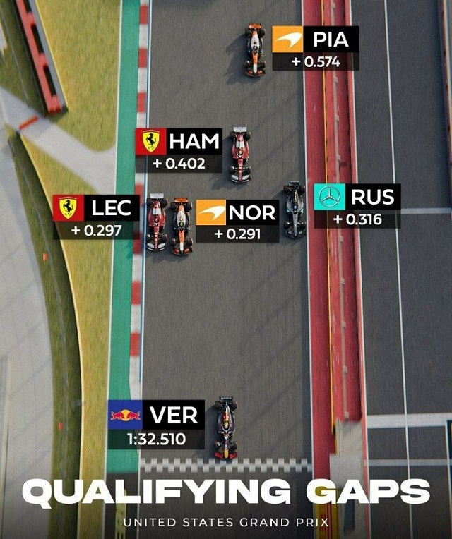 До цієї події JUST FORMULACAR підготували візуалізацію відривів у спринт-кваліфікації Гран-прі США, яка показує розриви між пілотами Макларена, Ред Булл, Мерседес та Феррарі.