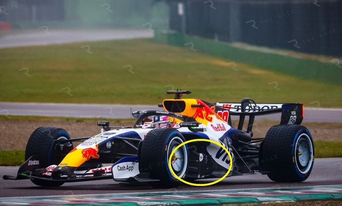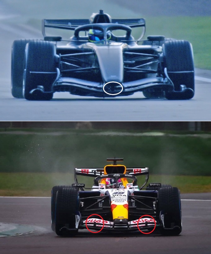 Каділлак використав один центральний механізм активної аеродинаміки, розмістивши його під носом боліда (білий еліпс на фото знизу). Рейсінг Буллз, своєю чергою, пішли іншим шляхом – із двома кріпленнями, по одному з кожного боку (червоні кола на знімку).